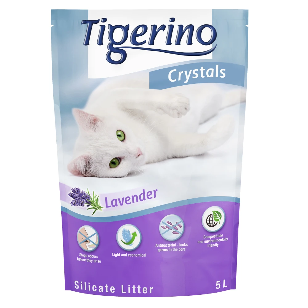 Tigerino Crystals Lavendel kattengrit bevat een heerlijk lavendelgeur en absorbeert geurtjes, dankzij het unieke silicaat, binnen seconden! Dit kattengrit kan geurtjes en vloeistoffen via speciale wijze opnemen: Tigerino Crystals silicaatkattengrit kan bijna evenveel gewicht aan vloeistoffen opnemen als zijn eigen gewicht. Niet alleen de urine, maar ook de vervelende geurtjes en de bacteriën worden binnen seconden door het kattengrit opgenomen: na verloop van tijd verdampt de vocht uit het kattengrit, maar de geurmoleculen blijven gebonden. Het kattengrit bevat vele microporiën, waardoor het vocht zeer snel kan worden geabsorbeerd. Hierdoor blijft uw kattentoilet droog. Tigerino Crystals Lavendel in één oogopslag: absorbeert vervelende geuren binnen seconden met een heerlijke geur van lavendel extreem absorberend – zeer licht en duurzaam gemakkelijk in gebruik en vrij van stof remt de groei van bacteriën Duurzaamheid bij 5 L Tigerino: 1 kat: ca. 25-35 dagen 2 katten: ca. 15-20 dagen 3 katten: ca. 8-12 dagen Nieuwe look, bewezen kwaliteit! We herzien momenteel het Tigerino ontwerp voor u. Daarom kunt u tijdens de overgangsfase uw Tigerino nest in zowel het oude als het nieuwe ontwerp krijgen.
