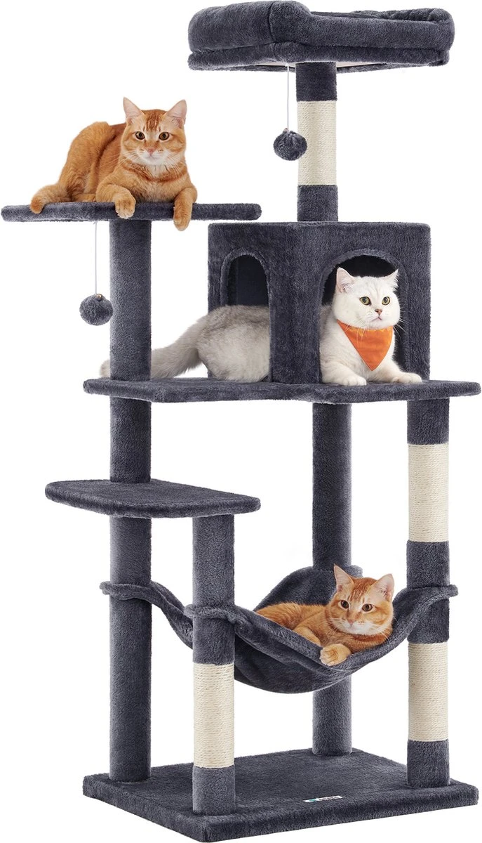 We weten dat je kat graag uit je raam naar de bomen kijkt. Nu heb je een krabpaal voor ze! De knuffelige grot in de boom geeft je kat een gezellige plek om zich terug te trekken en te ontspannen. Willen rondspringen? Geen probleem! Met een verstevigde bodemplaat en een extra kantelbeveiliging heeft deze krabpaal extra stabiliteit zodat je kat stoom af kunt blazen. Je kunt zelfs twee kattenvrienden uitnodigen (elk max. 5 kg). De kattenboom is een uitstekende plek om te ontspannen. Heb je onderstaande hangmat al gezien? Die is heel zacht! Je kat kan erin liggen en ontspannen. Een gemakkelijke montage en geen zorgen! Dankzij de duidelijke instructies en de gemarkeerde onderdelen kan je deze krabpaal snel opzetten. Je kat hoeft niet lang te wachten om zijn nieuwe koninkrijk te krijgen. Met een krabpaal als deze heeft je kat veel te doen wanneer het baasje niet thuis is: relaxen, strekken, spelen… Bovendien voelt het zachte oppervlak als een omhelzing! Productdetails: – Kleur: rookgrijs – Materiaal: spaanplaat, pluche, sisal – Afmeting: 55 x 45 x 143 cm (L x B x H) – Gewicht: 13 kg