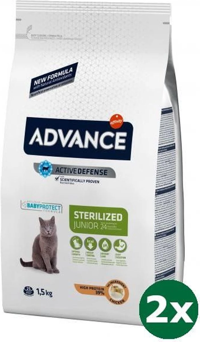 Advance Cat Junior Sterilized 1,5 kg Advance Cat Junior Sterilzed 1,5 kg is compleetvoer voor gesteriliseerde kittens tot 24 maanden, voor een ideale urine-PH en spierontwikkeling. Dit voer van Advance helpt jouw kitten gezond te houden na een castratie of sterilisatie. Zeer effectief zijn de mineralen en ingrediënten die zorgen voor een optimale PH van de urine, wat blaasproblemen helpt voorkomen. Omdat gesteriliseerde en gecastreerde katten ook vaak last krijgen van overgewicht, helpt het voer door toevoegingen als vezels en L-carnitine het gewicht te controleren en zorgt het voor een goede darmwerking. Tegelijkertijd wordt de spieropbouw ondersteund door het hoge gehalte eiwitten. Omega 3 en 6 zorgen voor een gezonde huid en vacht en een correcte, gezonde ontwikkeling.- Volledig voer voor jonge gesteriliseerde en gecastreerde katten tot 24 maanden- Zorgt voor een goede PH van de urine- Ondersteunt de spieropbouw- Helpt