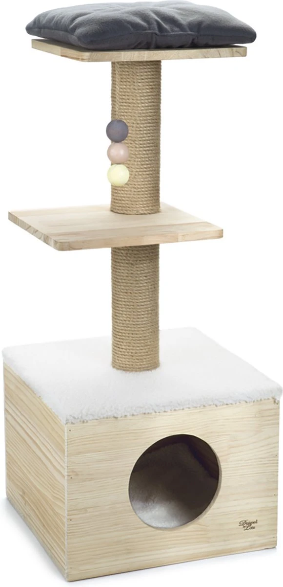 Klimmen, spelen of lekker een dutje doen, het kan allemaal in de Designed by Lotte Kamina Krabpaal. Het onderste plateau van dit krabmeubel is voorzien van een zacht dekentje en bovenop de krabpaal is een plateau met kussentje te vinden. Hier kan jouw kat lekker een dutje op doen of juist alles in de gaten houden. Aan de onderkant van de paal bevindt zich een knus huisje, waar jouw kat lekker kan slapen op het dekentje. Tot slot is de paal zelf voorzien van sisal, zodat jouw kat ook zijn natuurlijke krab behoefte kwijt kan. Ook zijn er nog speelballetjes te vinden, waar jouw kat heerlijk mee kan spelen. – Voorzien van sisal touw – 3 zachte ligplekken Afmeting: 40x40x95 cm