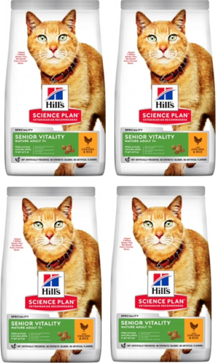 Hill’s Science Plan Mature Adult Senior Vitality kip en rijst kattenvoer is een droogvoer voor oudere katten van 7 jaar of ouder en bevat een unieke combinatie van ingrediënten die de interactie, energie, vitaliteit en de hersenfunctie ondersteunen. De toegevoegde vitamine E en omega 6-vetzuren bevorderen een gezonde, volle vacht. De licht verteerbare ingrediënten zijn speciaal samengesteld ter ondersteuning van de maag van oudere katten. Dit product is gemaakt met ingrediënten van hoge kwaliteit.