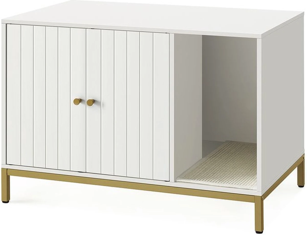 - Stijlvolle kattenbak: Met witte afwerking en gouden metalen frame is deze moderne kattenbak eenvoudig in je kamer te integreren en een nieuwe look te geven aan de rommelige kattenbak.